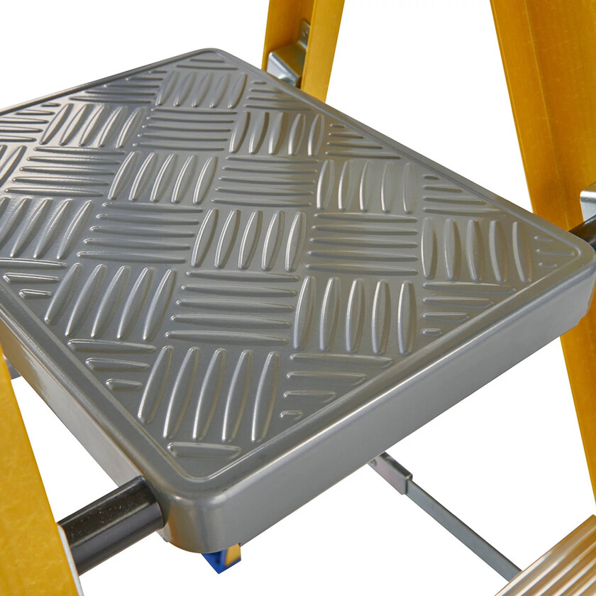 Robust trappstege i glasfiber för arbeten i elektriska miljöer. Trappstegen i glasfiber är perfekt för arbete i kemiska eller elektriska miljöer. Stor plattform i stål. Verktygshylla med möjlighet för smarta tillbehör. Godkänd enligt den senaste EN 131 standarden för professionellt bruk.